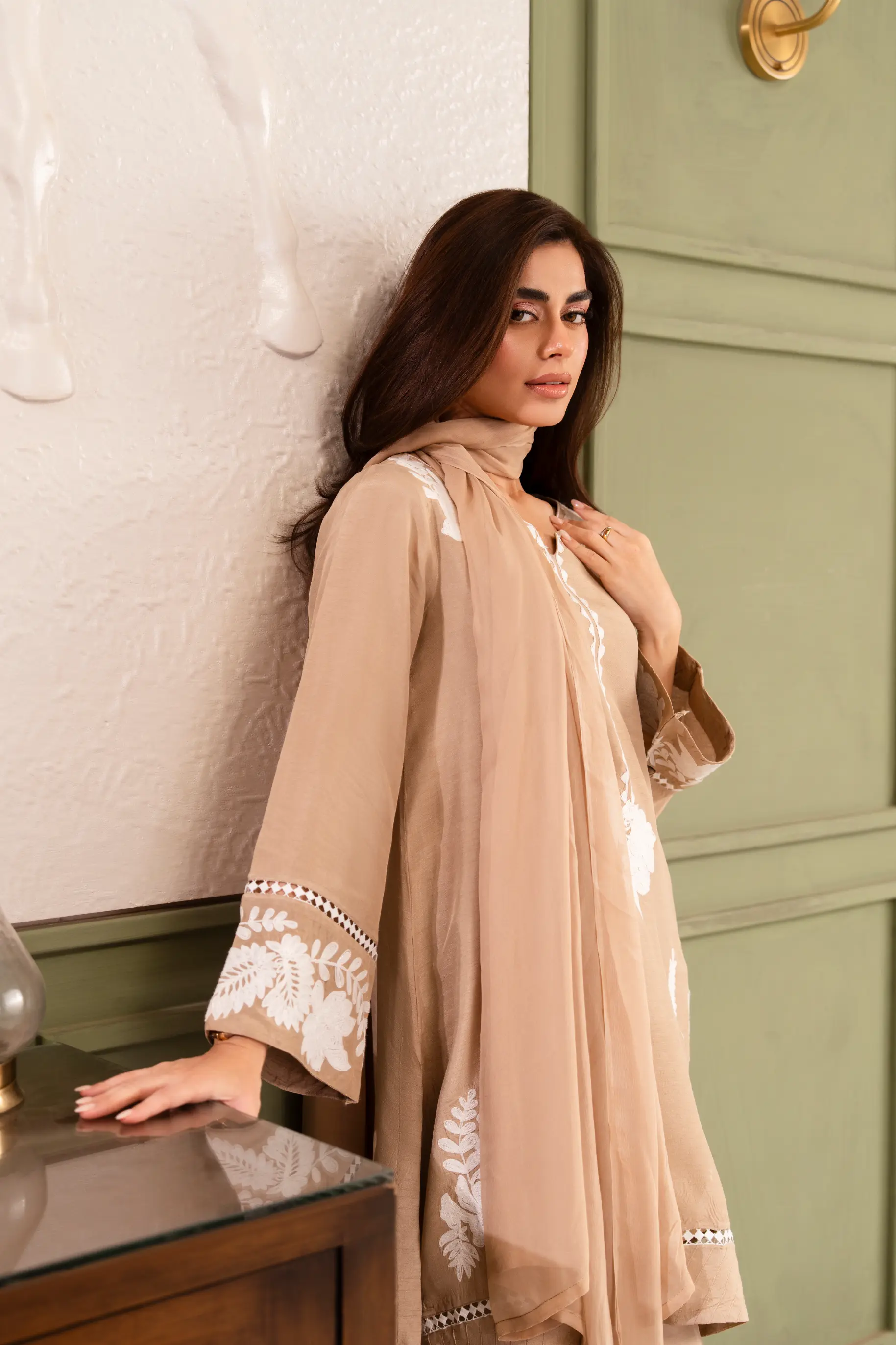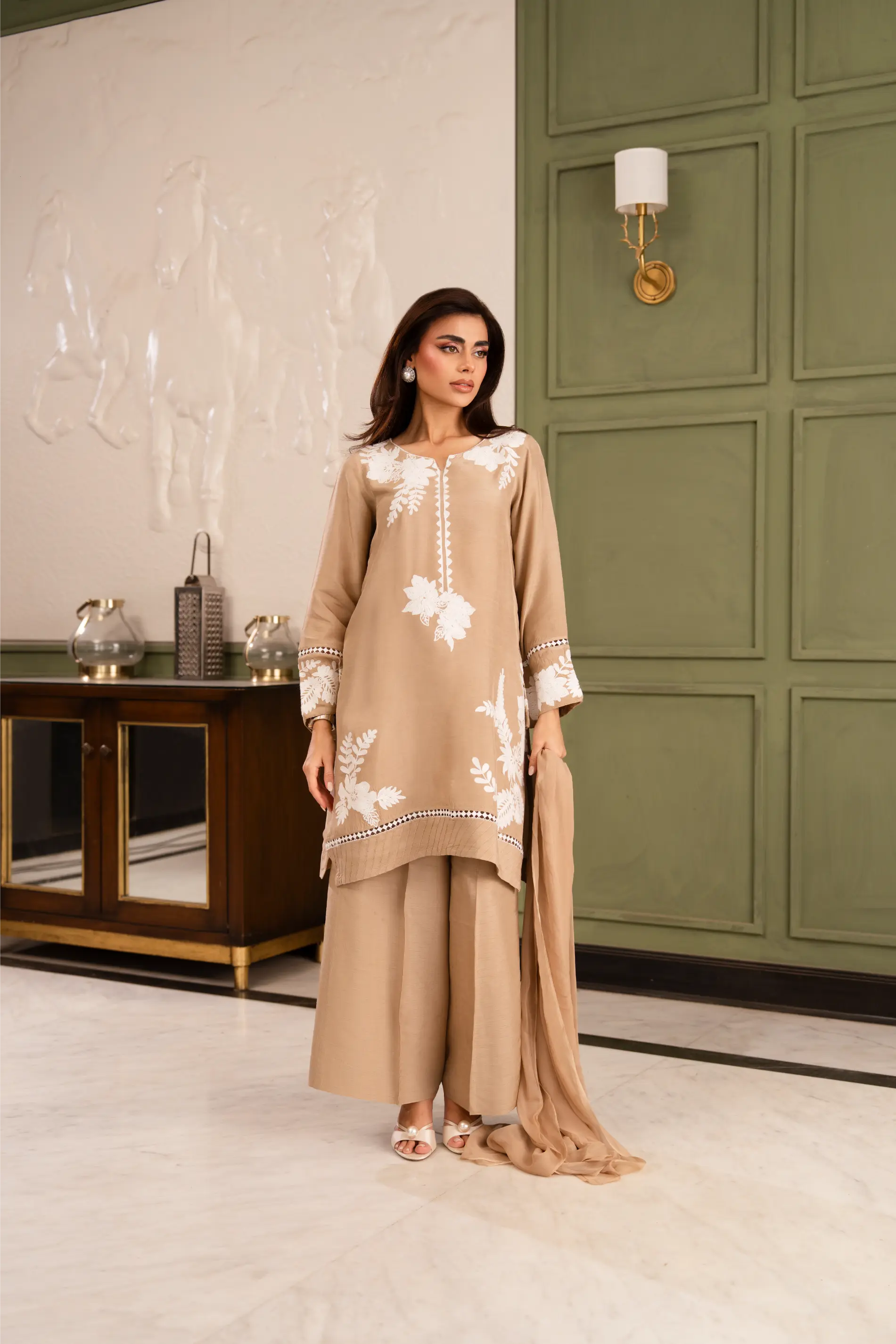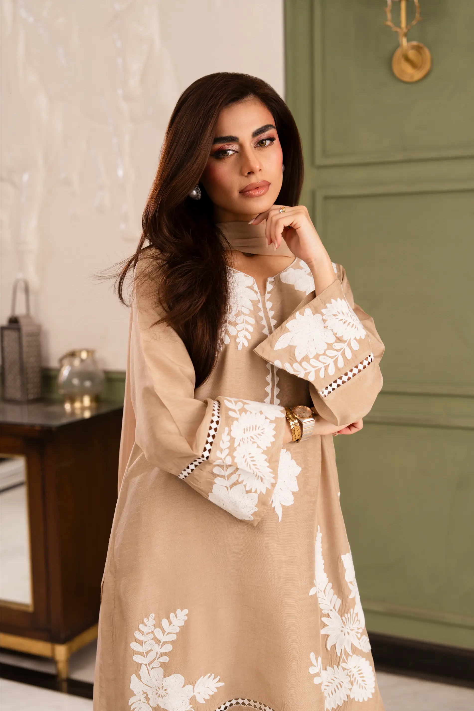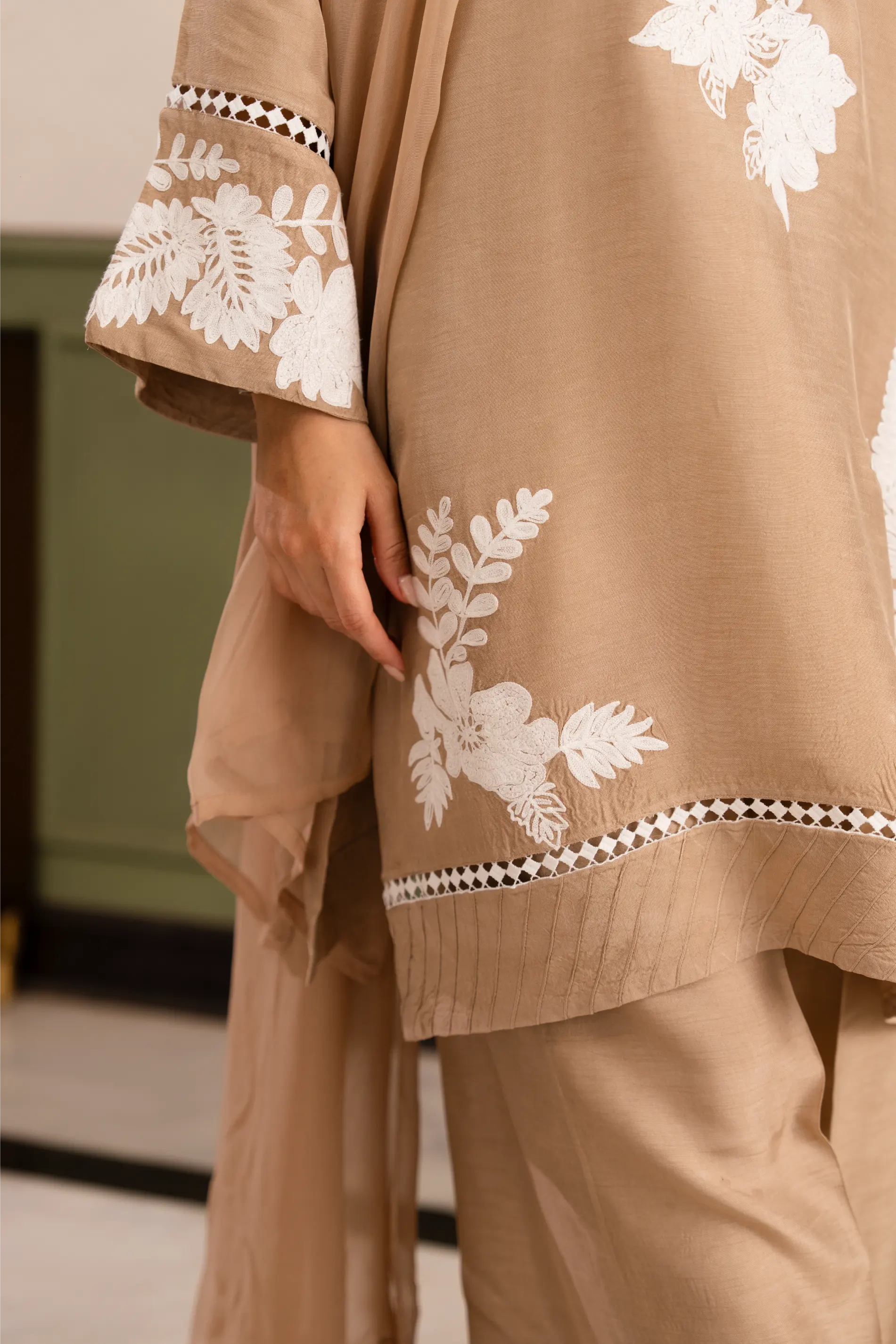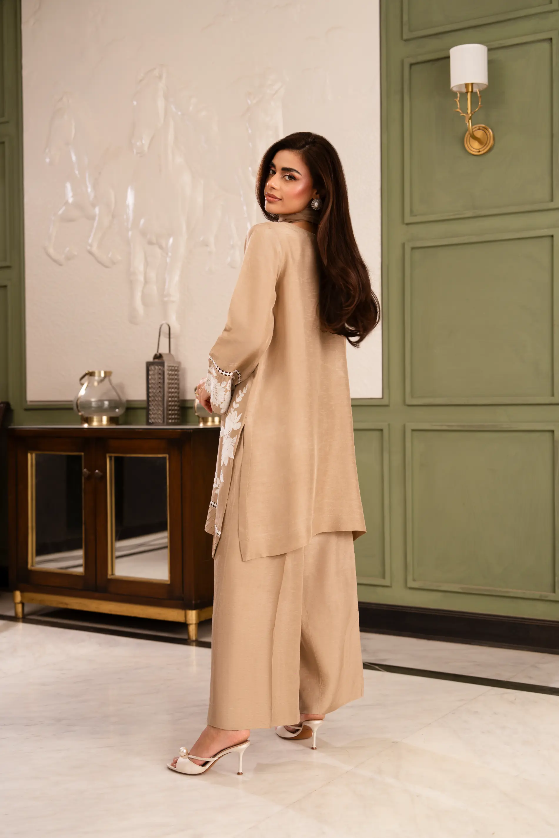 This luxurious Champagne Gold set radiates understated elegance. The shirt is fully adorned with intricate hand-done aari embroidery, lace-insertions and pleated detailing showcasing exceptional craftsmanship. Its deep, rich tone adds warmth and a refined aesthetic to the ensemble. Paired with matching culottes, the look remains cohesive and effortlessly graceful.