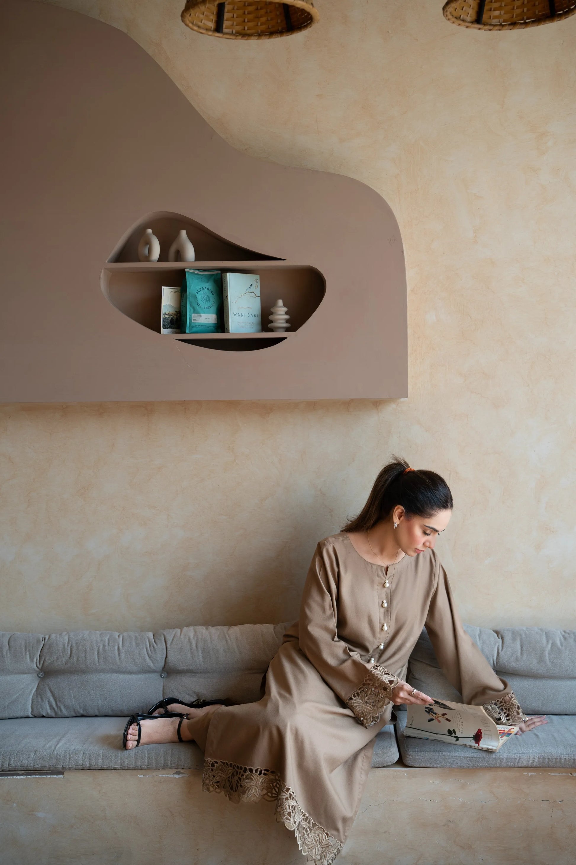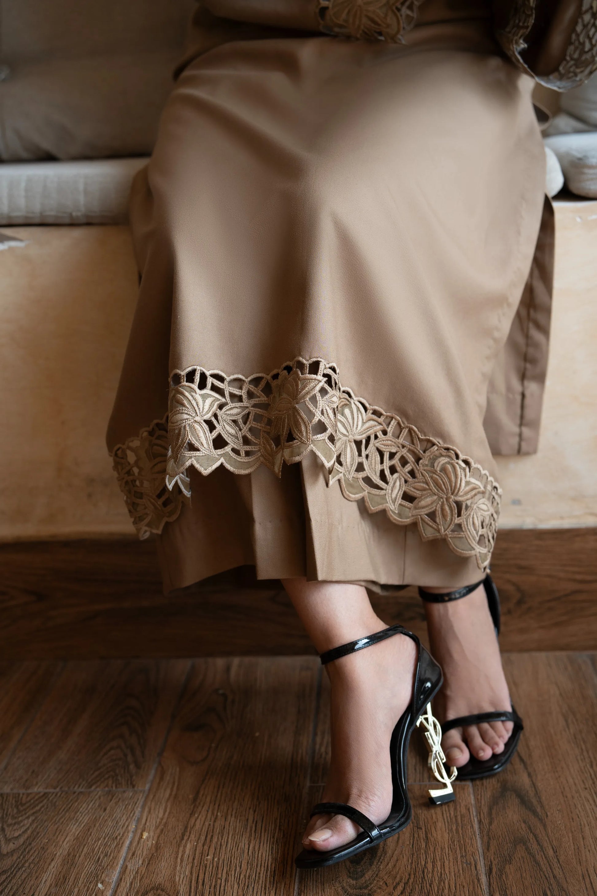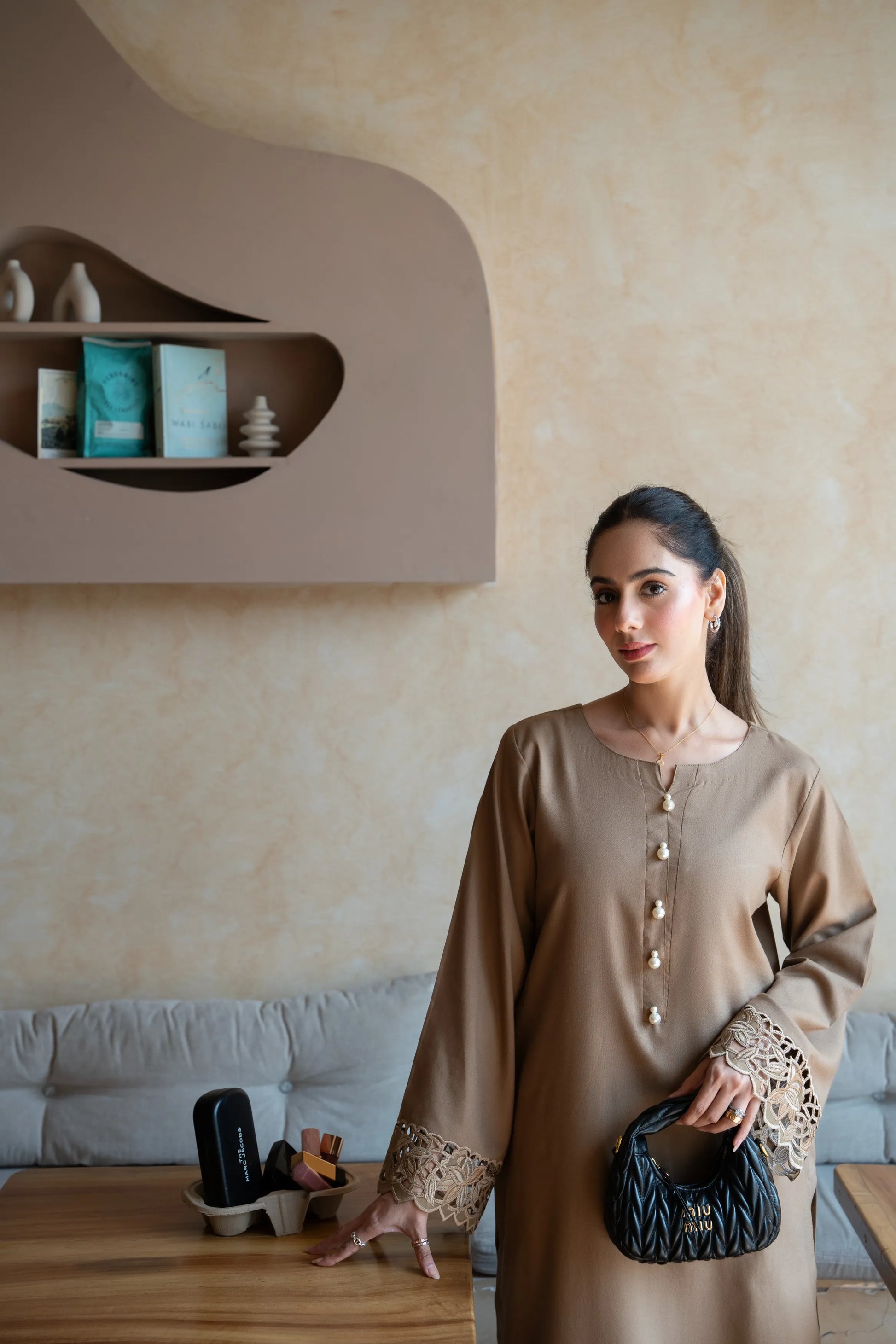 Understated yet undeniably elegant, this 2-piece cappuccino beige marina outfit exudes modern sophistication. Adorned with intricate 3D cutwork embroidery on the daaman and sleeves, the design adds texture and depth while keeping the look effortlessly refined. Chunky pearl detailing at the neckline enhances its versatility, making it a timeless addition to any wardrobe. With its contemporary silhouette and luxurious detailing, this ensemble is perfect for the fashion-forward woman who appreciates subtle glamour.